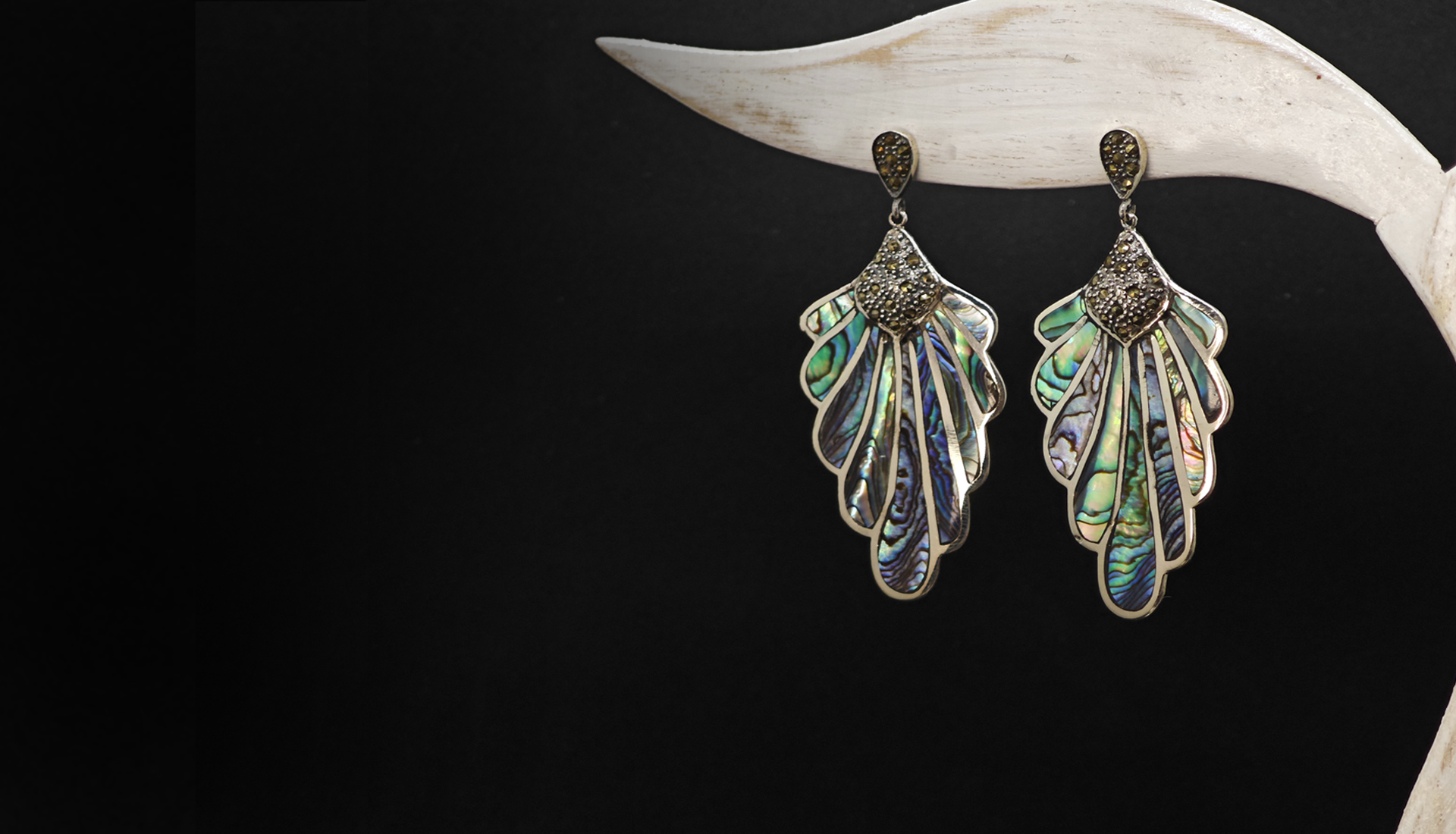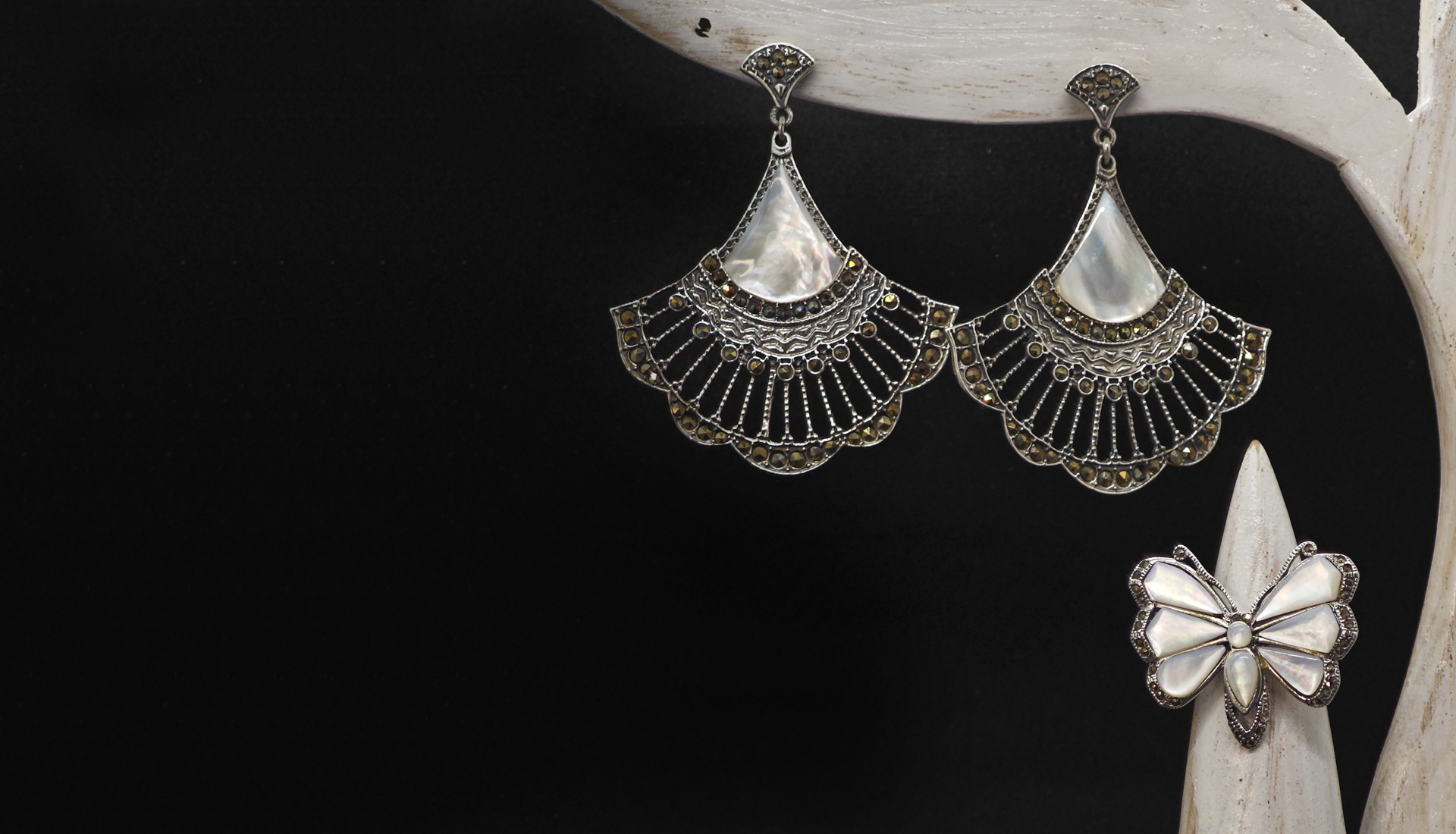 Art Deco Mother of Pearl Fan Earrings – 925 Sterling Silver with Marcasite