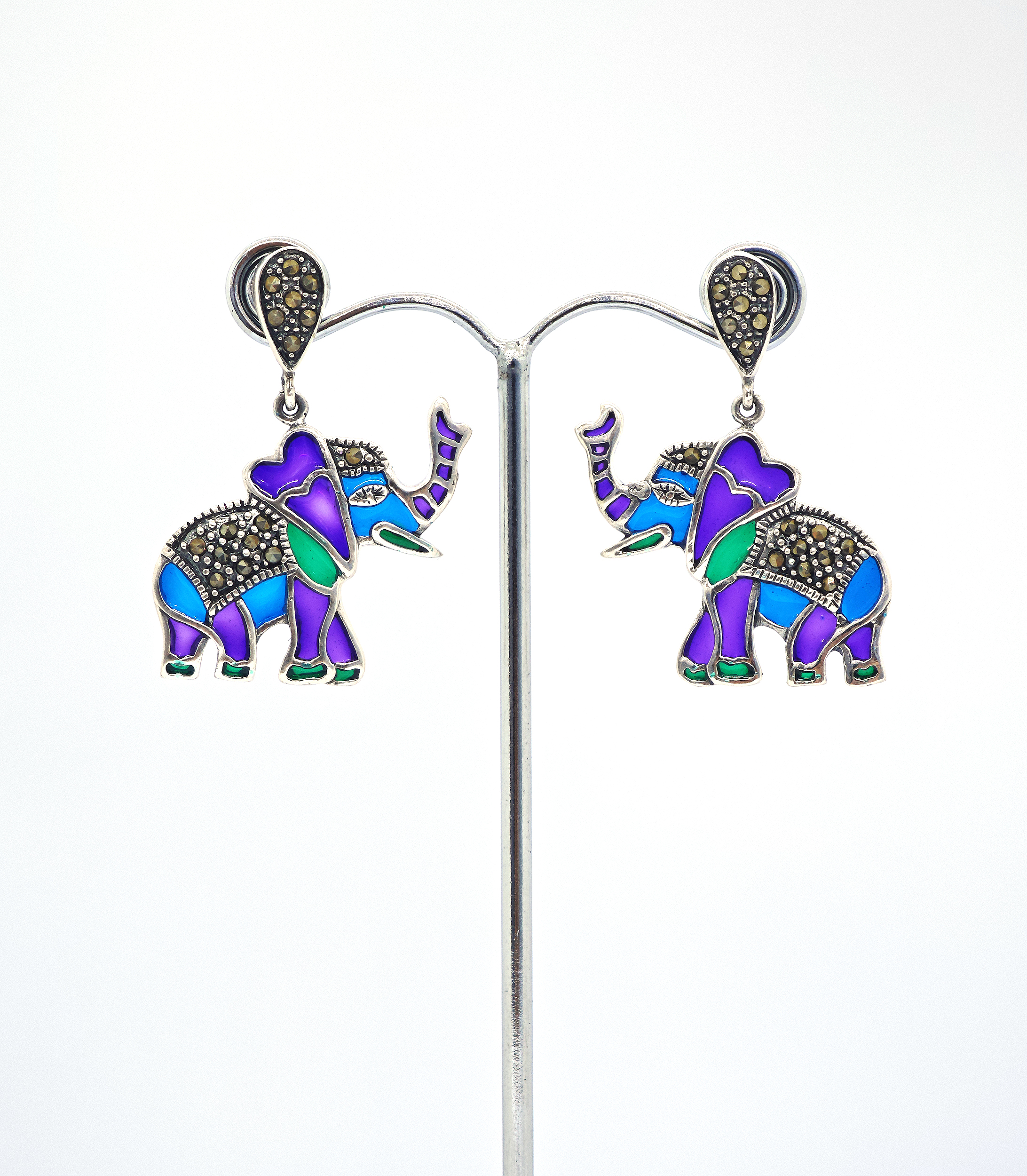 Celebrate charm and vibrant craftsmanship with these delightful elephant-shaped drop earrings, beautifully crafted in 925 sterling silver and accented with sparkling marcasite stones. The playful elephant design is enhanced with colorful hand-applied enamel in shades of purple, blue, and green, creating a lively and eye-catching look.